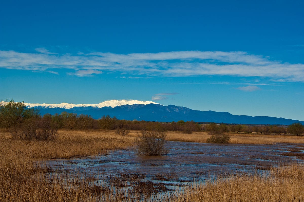 - Die schneebedeckten Pyrenäen erheben sich im Hintergrund der Aïguamolls de l’Empordà