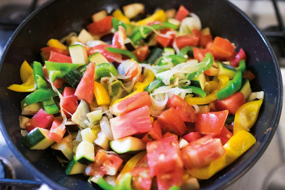 Das Gemüse würfeln. In einer Wokpfanne Olivenöl erhitzen. Zwiebel und Paprika anschwitzen. Dann restliches Gemüse und Knoblauch hinzugeben. Etwa 10 min köcheln lassen. Mit Salz und Pfeffer abschmecken.