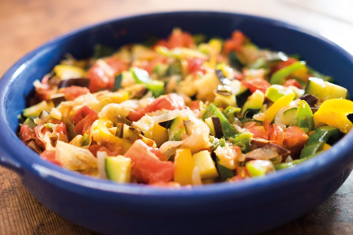 Das Gemüse würfeln. In einer Wokpfanne Olivenöl erhitzen. Zwiebel und Paprika anschwitzen. Dann restliches Gemüse und Knoblauch hinzugeben. Etwa 10 min köcheln lassen. Mit Salz und Pfeffer abschmecken.