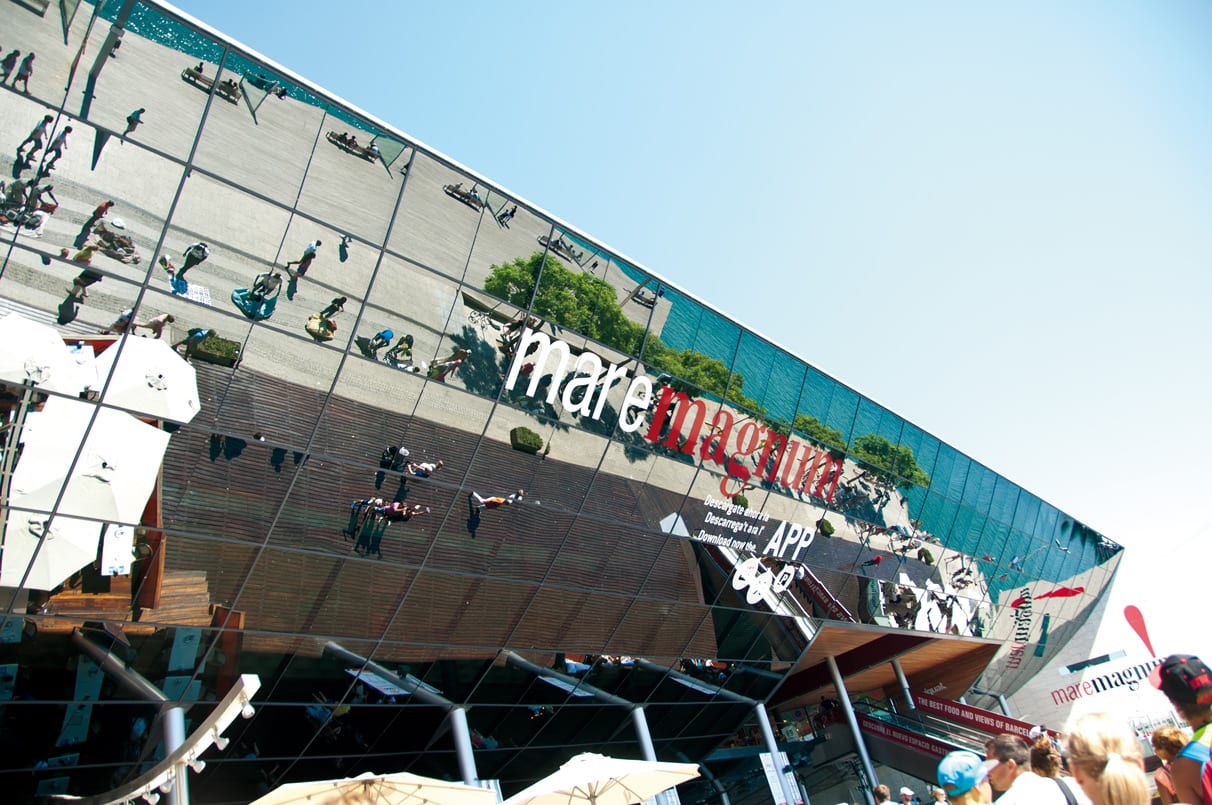 Mindestens ebenso beeindruckend wie die mit Jachten und Segelbooten gespickte Anlage ist die Fassade des Maremagnum Kaufhauses, in der man sich selbst vor dem Meer gespiegelt wieder findet. So verlockend es auch ist, das Einkaufen muss noch warten – immerhin bekommt man beim ersten Treffen auch noch keinen Diamantenring geschenkt.