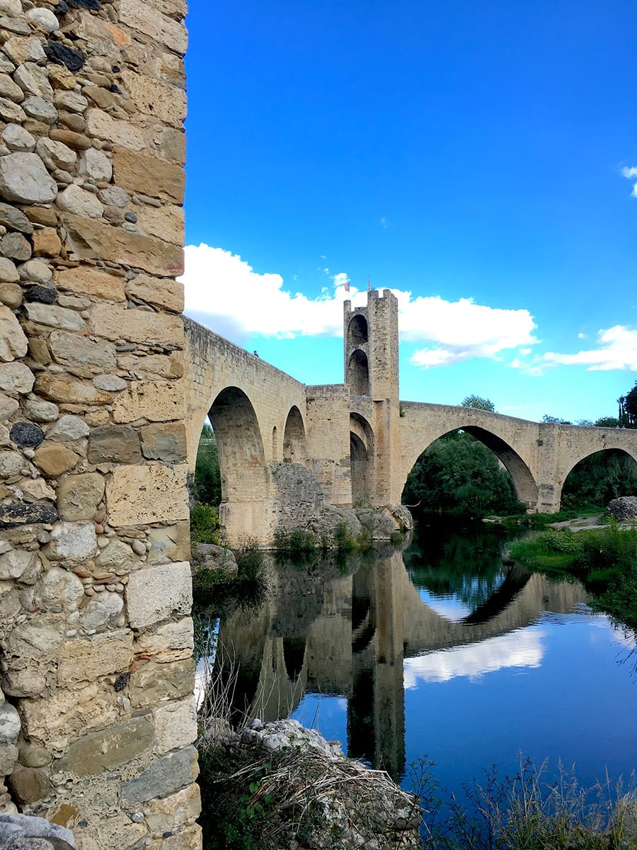 An der gigantischen, perfekt restaurierten Brücke Pont Vell beginnt unsere kleine Zeitreise durch Besalú. Sofort überwältigt die Aussicht auf die schöne, über 100 m lange Brücke, ihre zwei majestätischen Türme, auf das Flüsschen Fluvià, die malerische Altstadt mit den zahlreichen, mittelalterlichen Steinhäusern und die Ausläufer der Pyrenäen. Dieses magische Gesamtbild verleitet jeden dazu, die Kamera aus der Tasche zu ziehen und loszuknipsen.