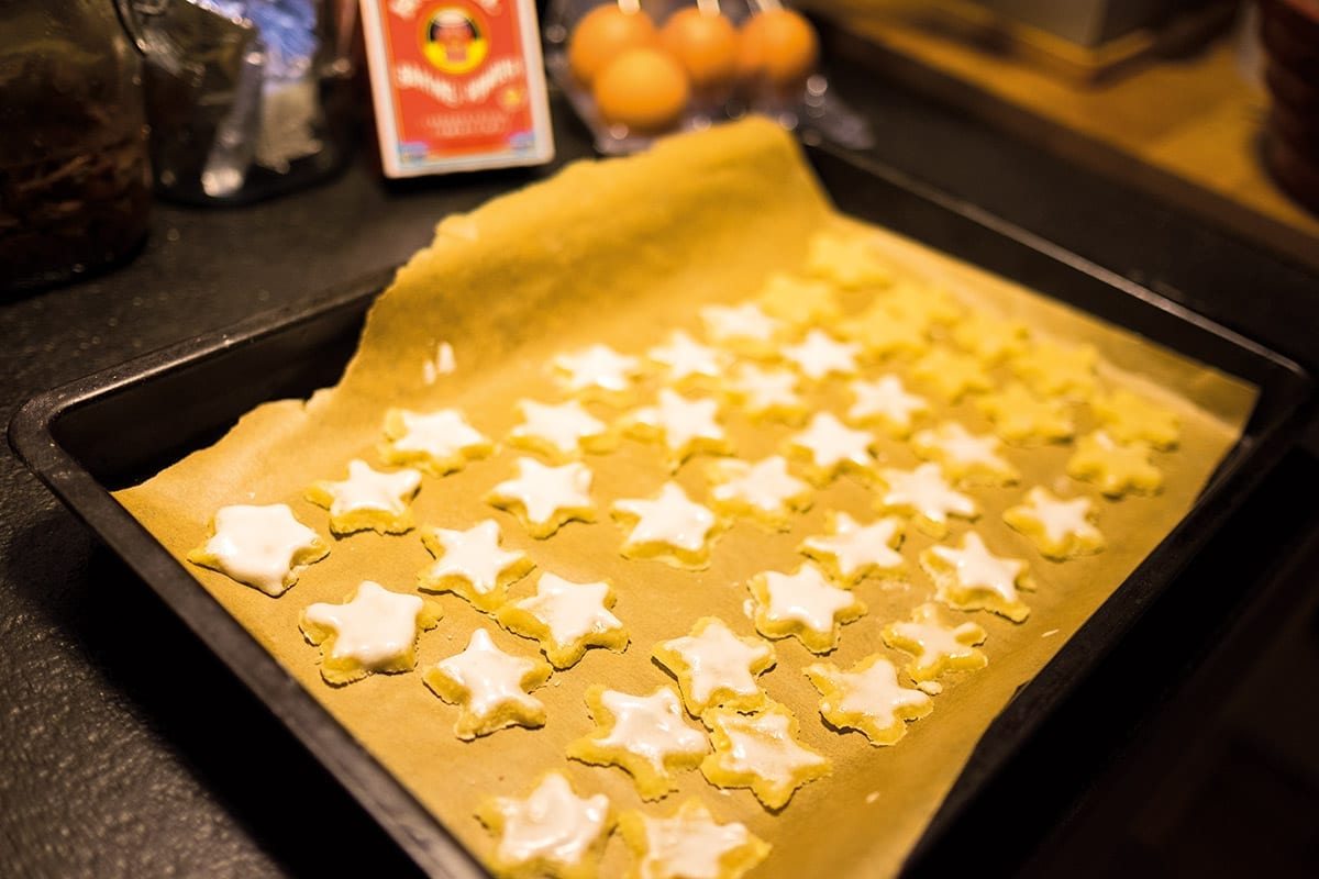 Die Arbeitsfläche mit geriebenen Mandeln oder Puderzucker bestäuben und den Teig auf 4 – 5 mm ausrollen. Die Zimtsterne ausstechen und auf ein mit Backpapier belegtes Backblech legen. Die Sterne mit der Eiweißmasse (Glasur) bestreichen.