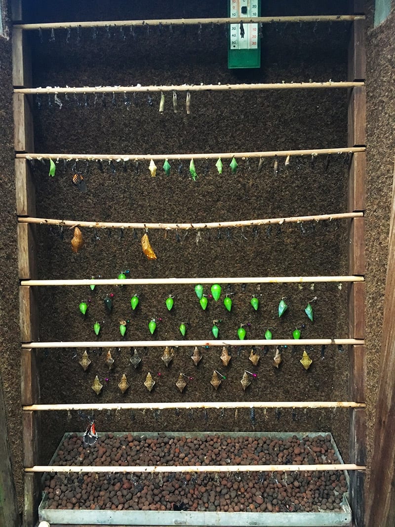 Und natürlich Schmetterlinge! Diese kann man noch eingepackt in ihren Kokons, schon beim Schlüpfen oder bereits fröhlich herumflatternd beobachten.