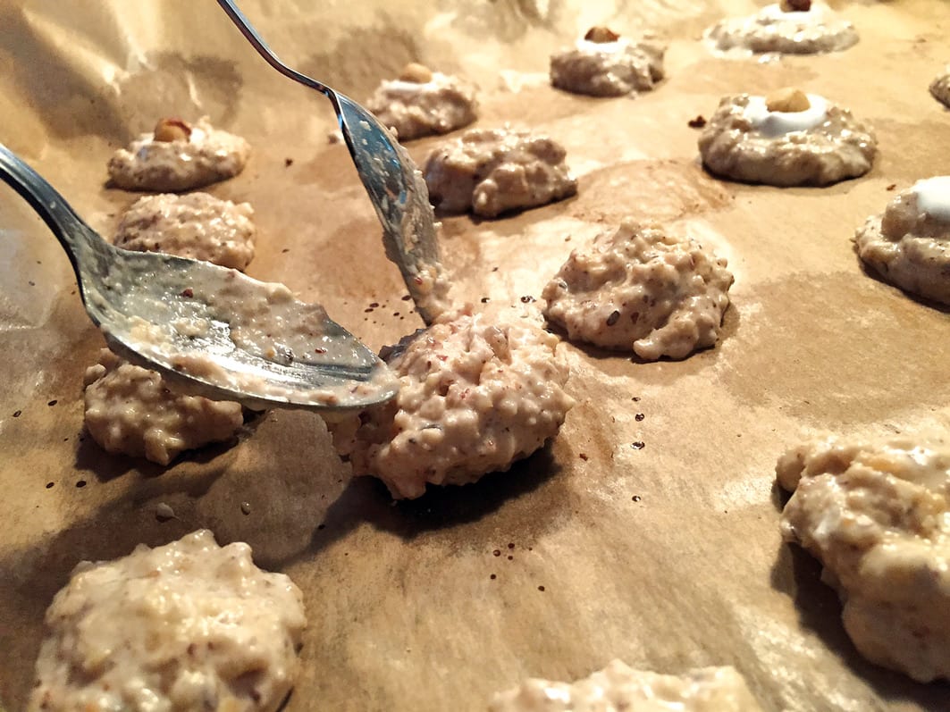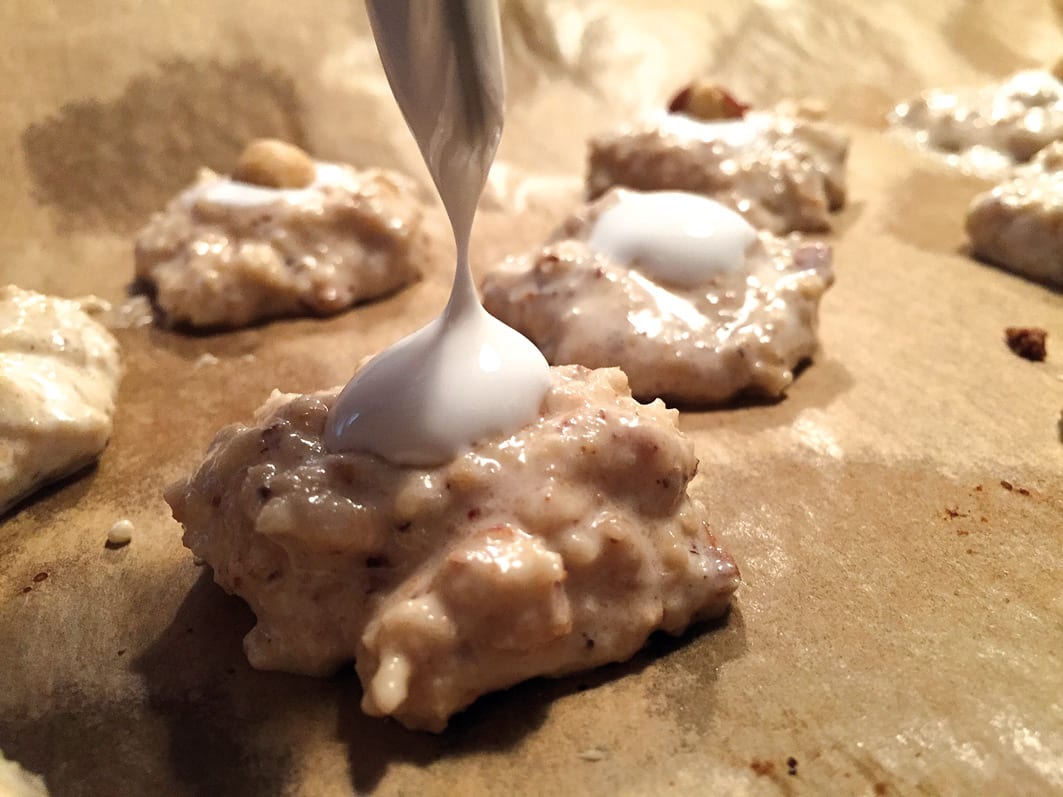 Eiweiß und Zucker sehr steif schlagen und zwei Esslöffel von der Masse abnehmen. Die gemahlenen Nusskerne vorsichtig unter die Masse heben, aus dieser Kügelchen formen und eine Vertiefung hinein drücken. Etwas von der zurückgelassenen Masse einfüllen und als Garnierung einen Nusskern hineinsetzen. Bei 140-160° 20-25 Minuten backen.