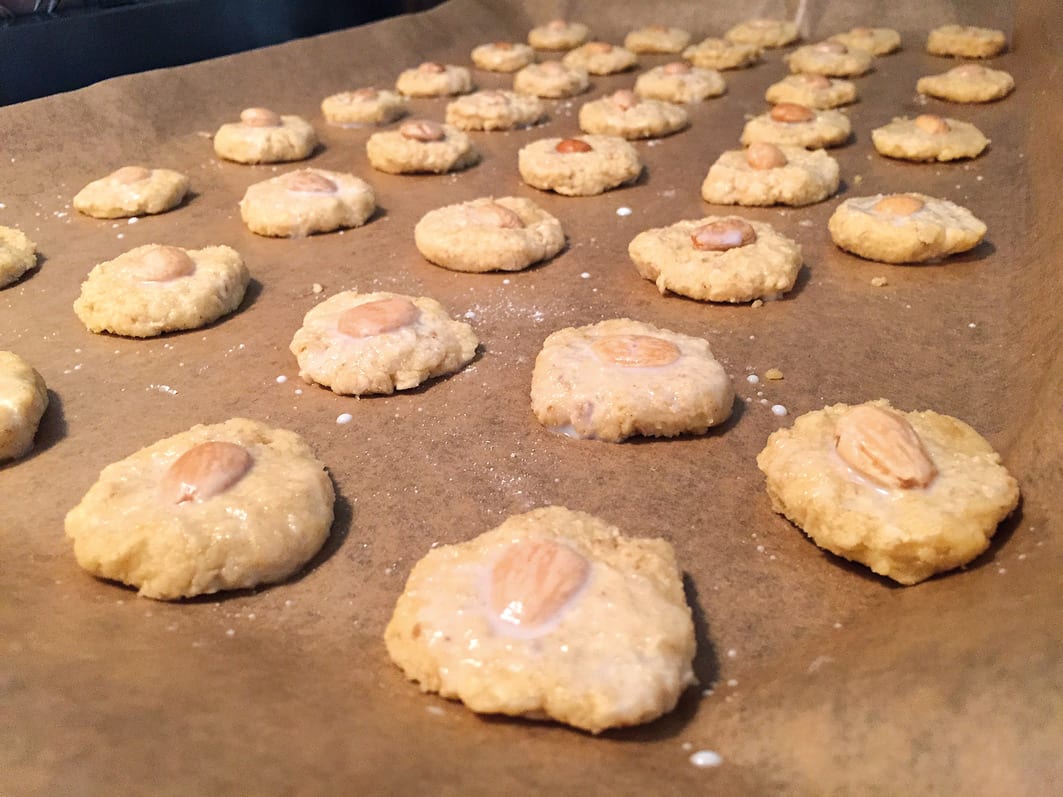 Margarine, Puderzucker, Vanillezucker und Salz schaumig rühren, dann Mehl, Haferflocken und gemahlene Mandeln unterrühren und zu einem glatten Teig verkneten. Den Teig in zwei Rollen formen und Scheiben abschneiden. Auf einem Backblech verteilen, die abgezogenen Mandeln in Milch tauchen und auf den Scheiben verteilen. Auf mittlerer Schiene bei 175° 12-15 Minuten backen.