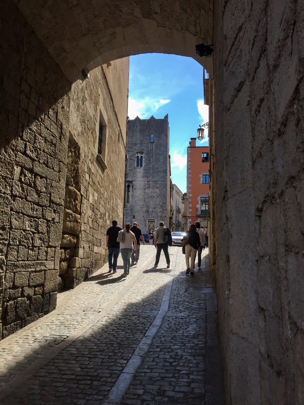 Unten angelangt, gehen wir auf der Carrer de la Força weiter Richtung Altstadt und Judenviertel. Enge, dunkle Gassen erwarten uns und es wird uns klar, warum Girona als mittelalterliche Filmkulisse diente. Auch wir selbst fühlen uns in eine andere Zeit zurückversetzt. Die Straße der Kraft war von 889 bis 1492, also 600 Jahre lang (!!!) Teil des Judenviertels, auch Call genannt, und bildete mit den umliegenden Gässchen und Gebäuden einen eigenen Mikrokosmos.