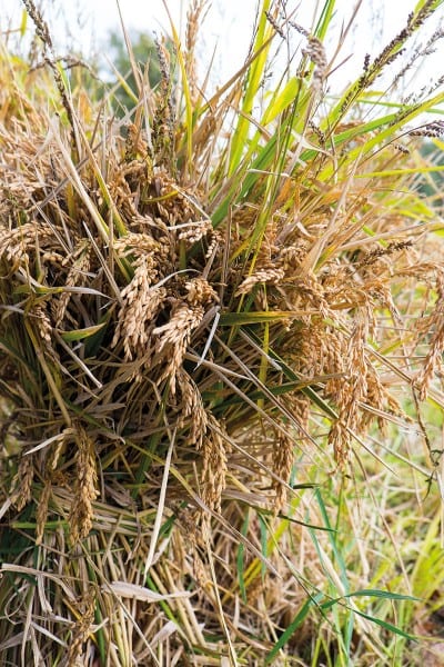 Nach dem Ernten wird die Reispflanze für den Transport gebunden